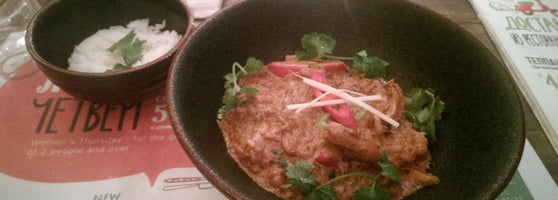 Вкусная и сытная курица в каррисоусе, её точно хватит, чтобы наесться до упора! Коктейли, если не сравнивать с качественными барами, хорошие. Например, мягкий Charlotte и крепкий Малиновый Рай