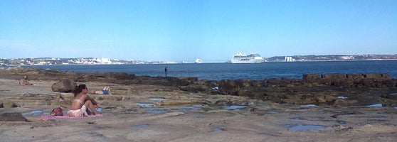 Pedaço de praia rochosa, vista para ponte 25 de Abril, só para tomar sol, mas é bem bonita, no verão maré é vazante e fica assim, muita paz! Cenário bonito! Passagem dos Cruzeiros!